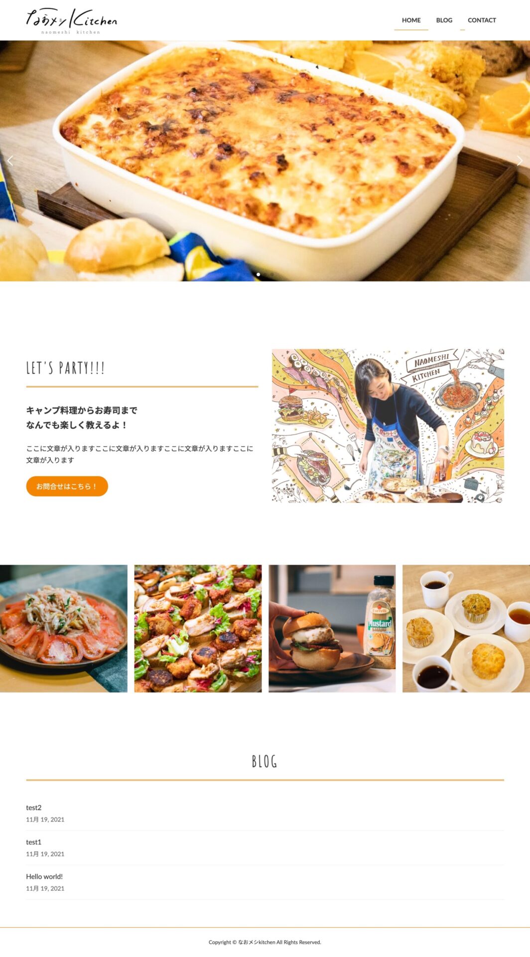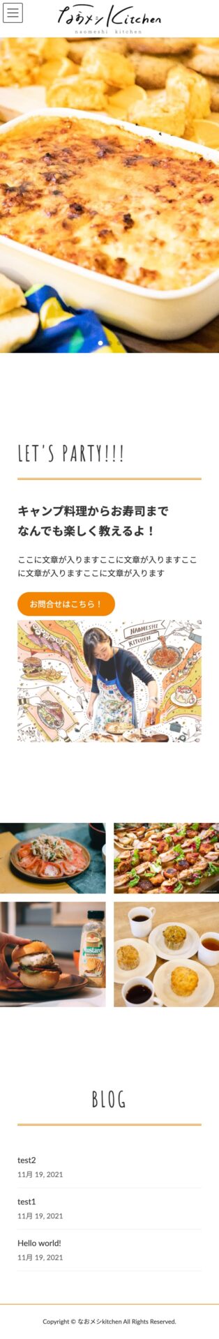 実在する料理教室、なおメシキッチン様に許可をいただき、Demoサイトを制作しました。WordPressテーマ「Lightning」を使用して制作しました。メインビジュアルのスライダー、お問い合わせフォームなど、頻出する機能を実装しています。更に見出しのフォント、下線の部分など追加CSSで装飾しています。