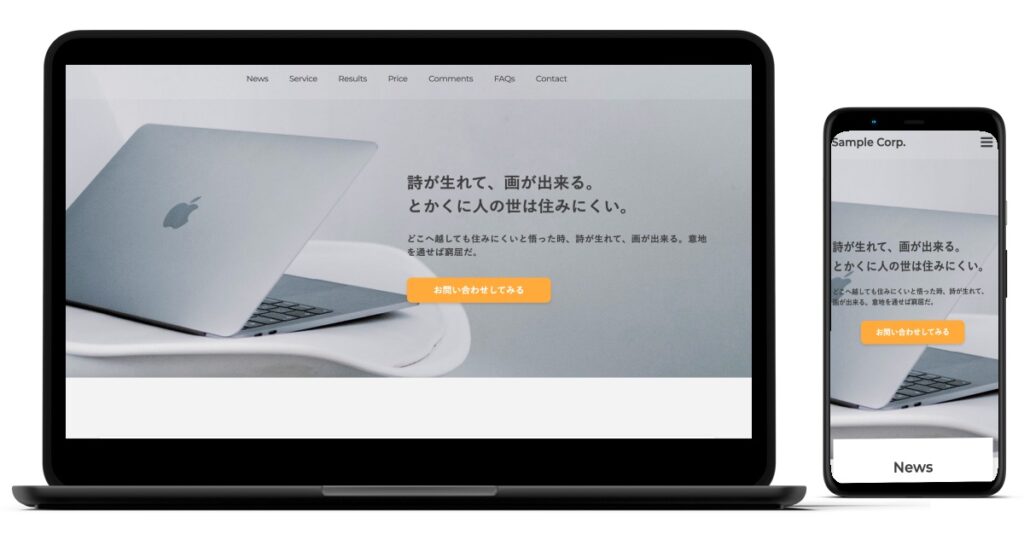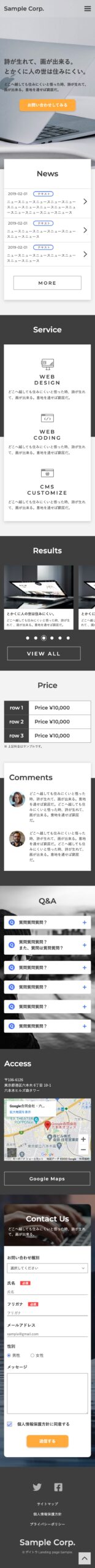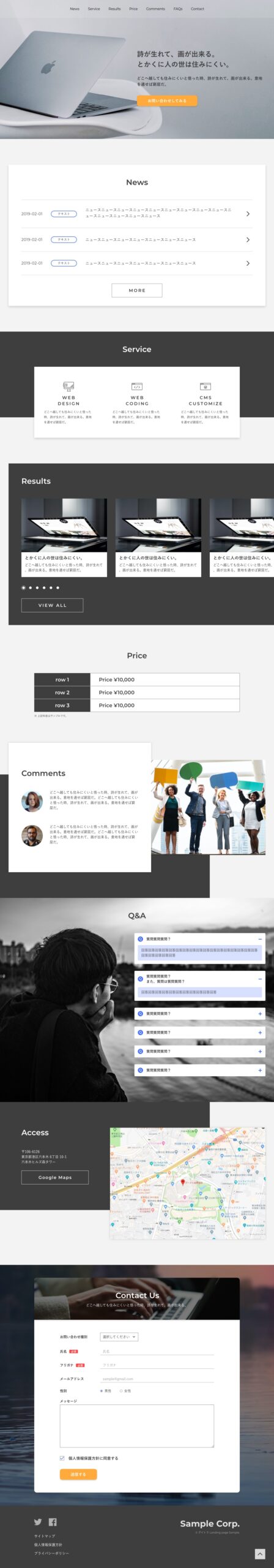 架空コーポレートサイトのデモサイトです。AdobeXDデザインカンプから、HTML / CSS(Sass) / jQueryコーディングをいたしました。レスポンシブ込みでコーディングを行い、お問い合わせフォームの実装、Google mapの埋め込み、Wow.jsを使用して画像がフワッと表示されるようにしたり、jQueryによるスムーススクロール、アコーディオン、スマホ時のハンバーガーメニューを実装、Swiper.jsを使用しスライダーも実装しました。更にChrome拡張機能、Perfect Pixelを使用してピクセル単位で調整を行いピクセルパーフェクトを意識したコーディングを行いました。