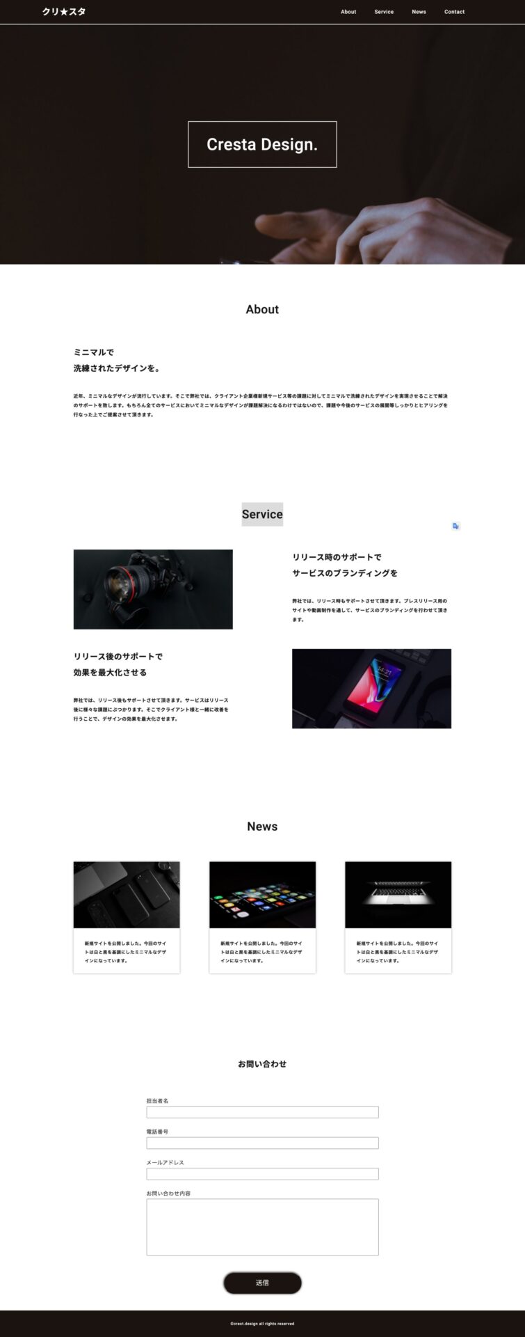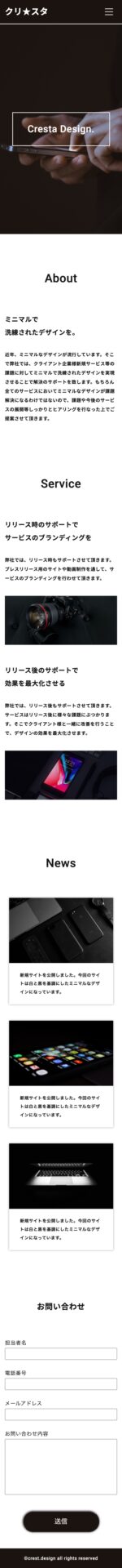 架空のデザイン事務所のサイトです。AdobeXDデザインカンプから、HTML / CSS / jQueryコーディングをいたしました。レスポンシブ込みでコーディングを行い、お問い合わせフォームの実装、jQueryによるスマホ時のハンバーガーメニューの実装もしました。
