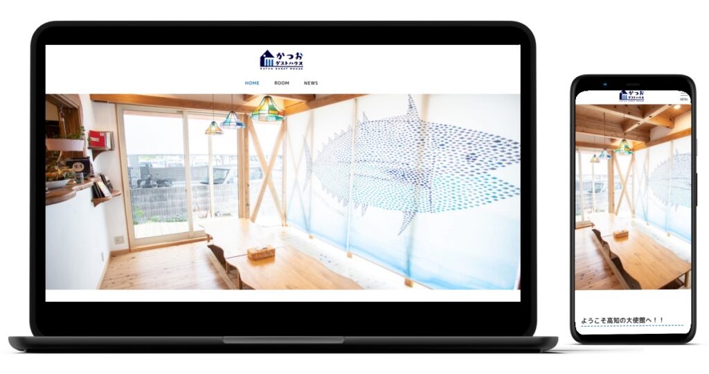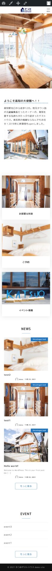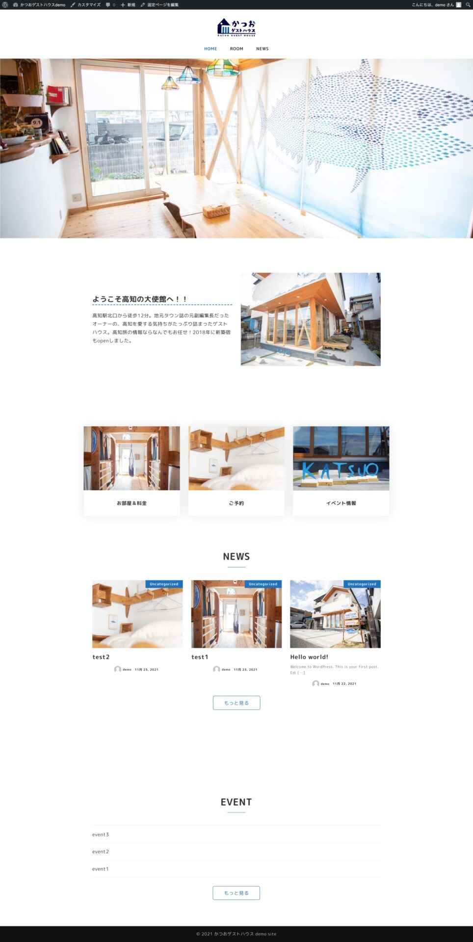 実在するゲストハウス、かつおゲストハウス様に許可をいただき、Demoサイトを制作しました。WordPressテーマ「Snow Monkey」を使用して制作しました。画像のフェイドアップアニメーション、カスタム投稿(イベント情報)など、頻出する機能を実装しています。更にトップページコンセプトの見出しの下線部分を追加CSSで実装しています。