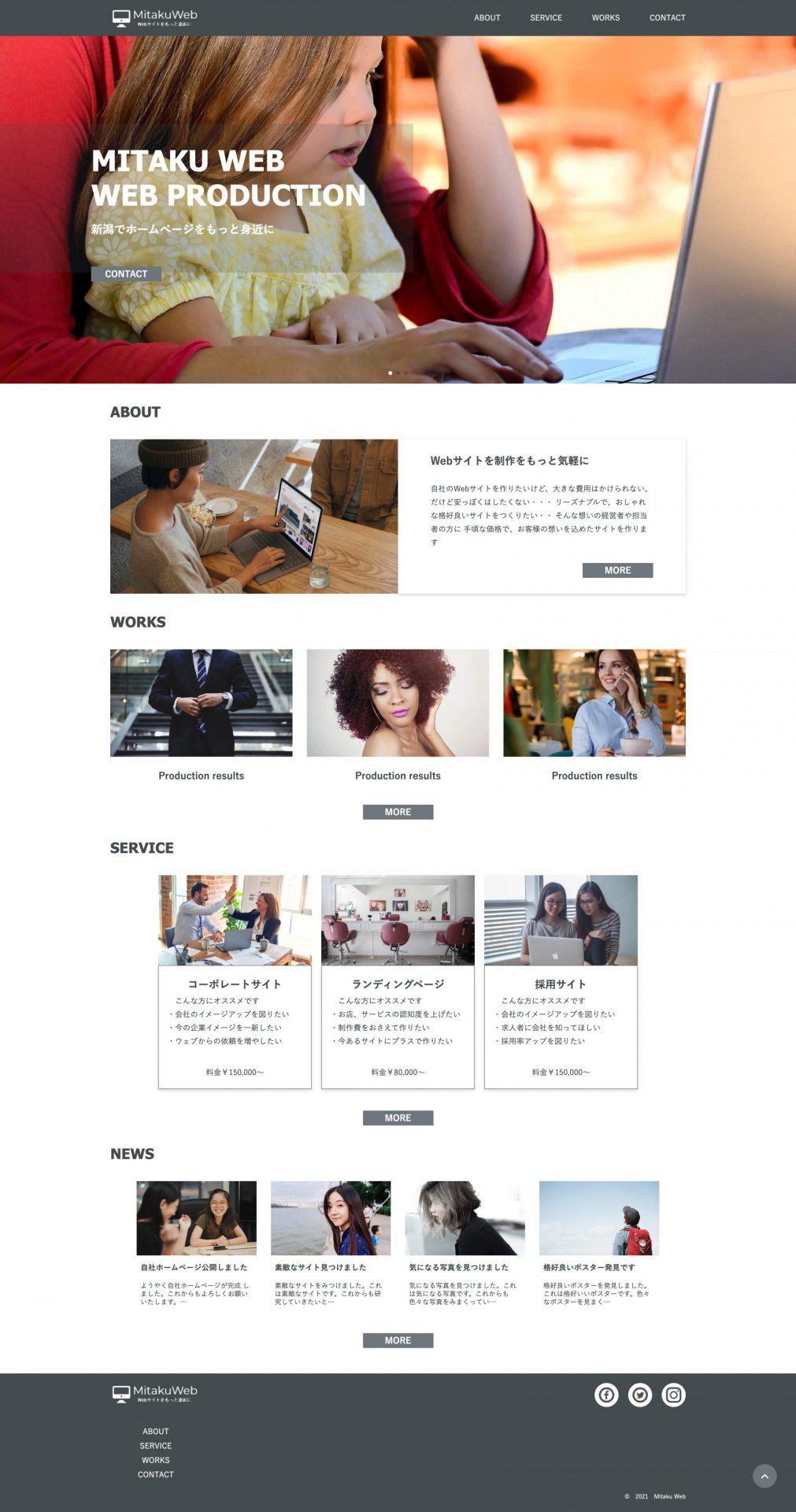 Mitaku Web (ミタクウェブ)という、架空のWeb制作会社のコーポレートサイトを制作しました。ペルソナ設定からコンセプト設定、XDでデザインカンプ作成、HTML / CSS(SASS) / jQueryでコーディング、サーバーへのアップロードまで行いました。お問い合わせフォームやレスポンシブ対応の他、要素にホバーした時のCSSアニメーション、jQueryでメインビジュアルのフェイドスライド、要素のフワッと表示、フローティングボタン、スムーススクロール、アコーディオンメニュー、スマホ時のハンバーガーメニューなども実装しました。