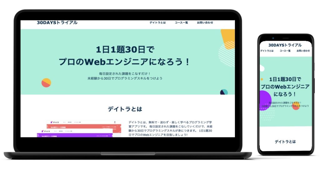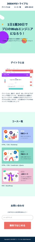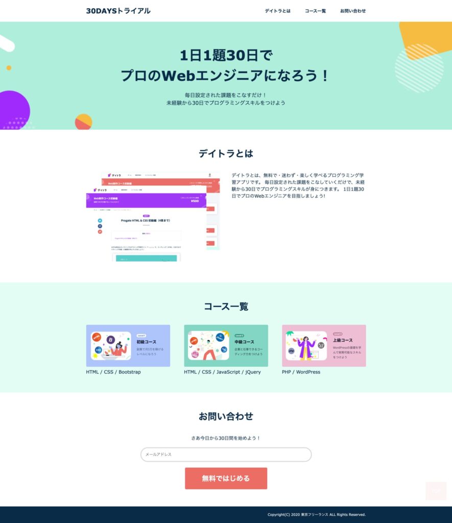 オンラインスクールデイトラのデモサイトです。見本サイトから、HTML / CSS / jQueryコーディングをいたしました。レスポンシブ込みでコーディングを行い、コース一覧のモーダル画像、トップに戻るボタンも実装しました。